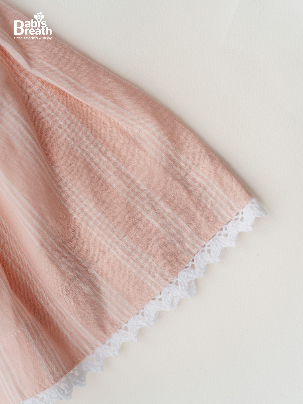A soft peach and off white striped cotton smocked dress trimmed with a self collar and small lace detailing. Very summery semi formal and soft for the hot season.