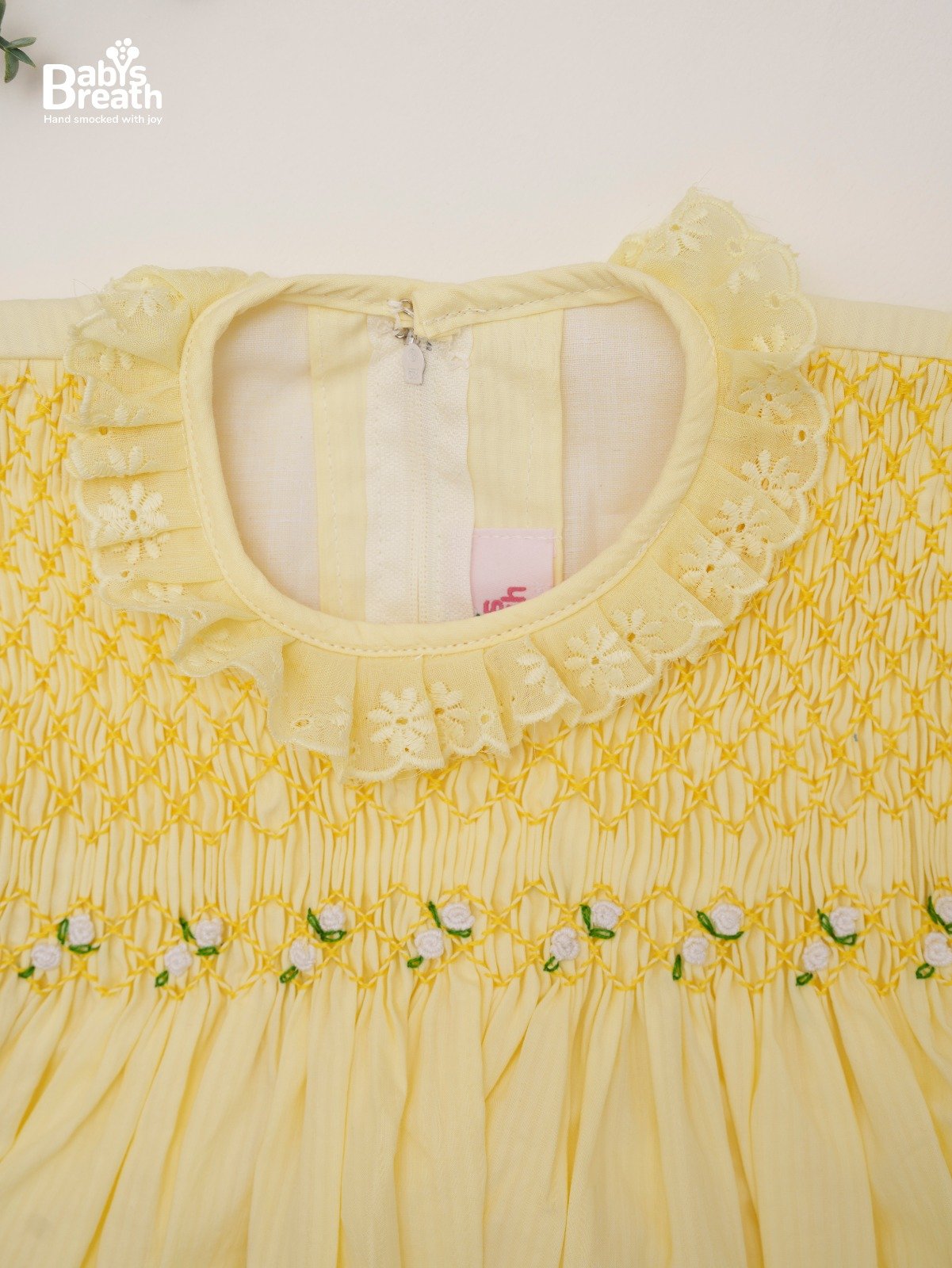 A white based pink floral dress in cotton smocked and trimmed with floral pink lace. Whites have a beautiful look with the smock looking so dainty and delicate!