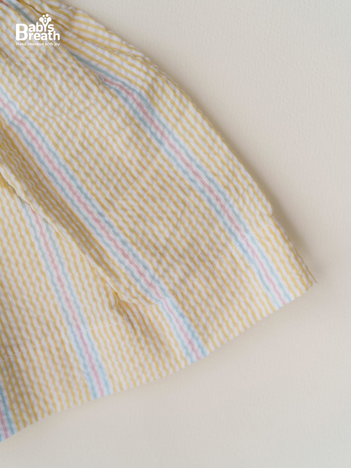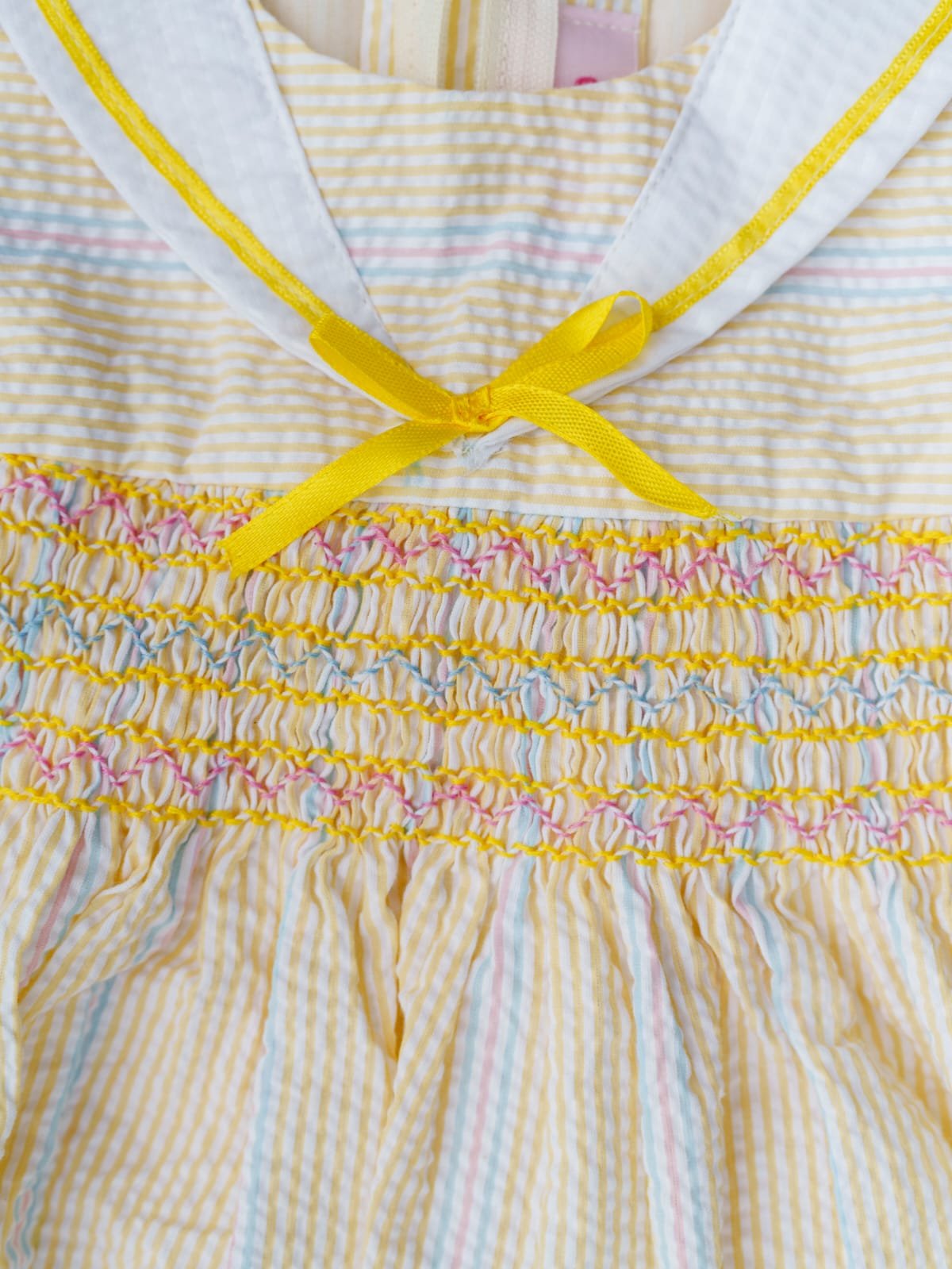 A bright yellow and blue striped searsucker smocked dress with a white navy collar trimmed with yellow satin and smocked on the waist.